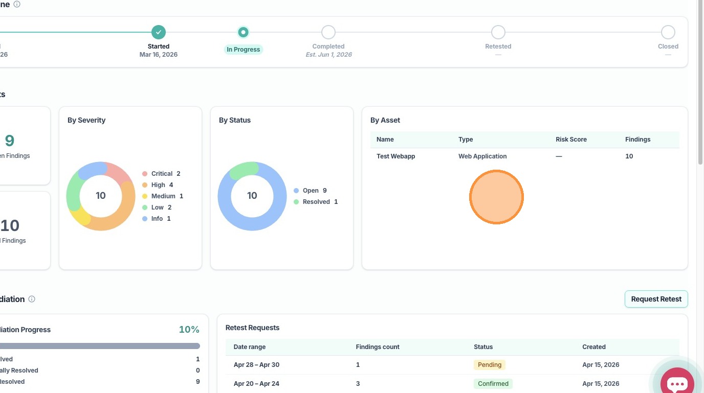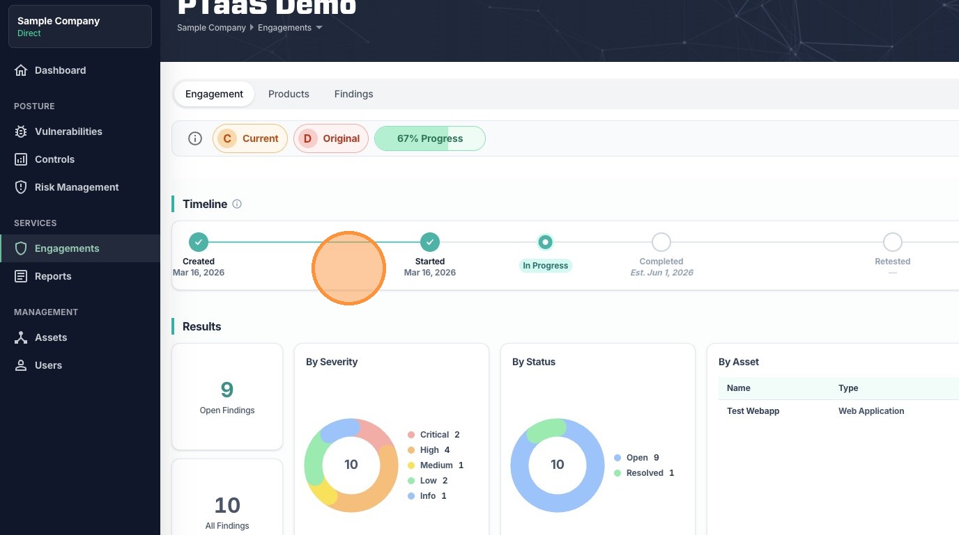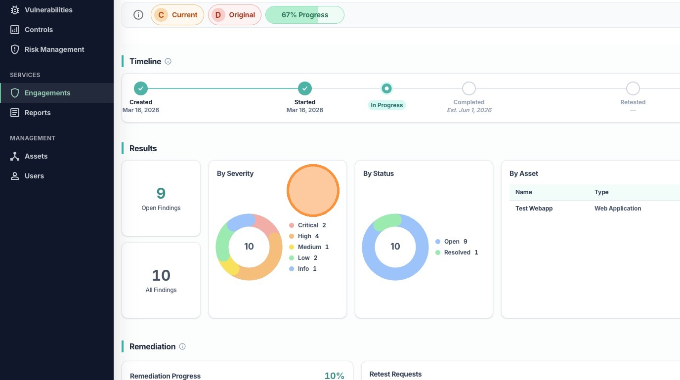 3. In the Dashboard, the first thing you will see is the engagement grades and progress. Original grade is calculated on all findings and Current grade is calculated on unresolved findings only.