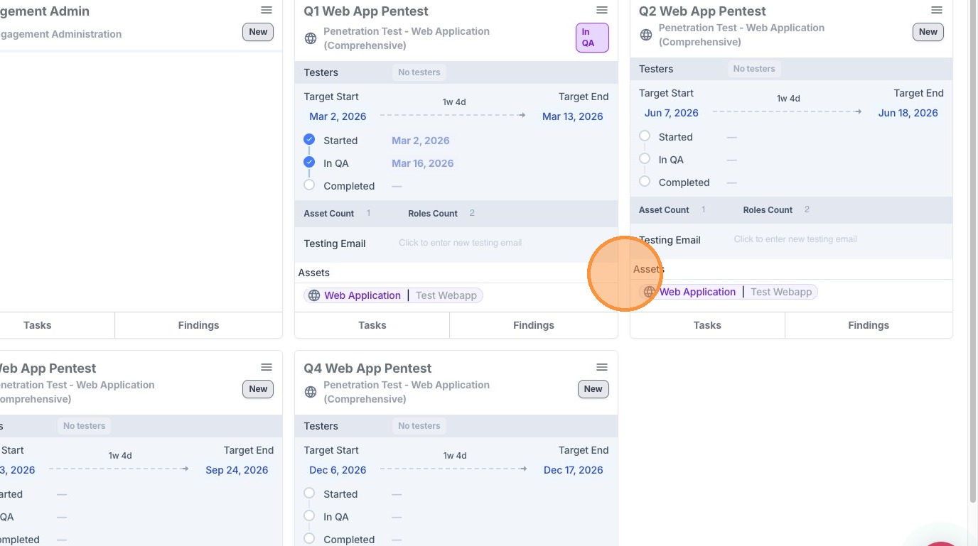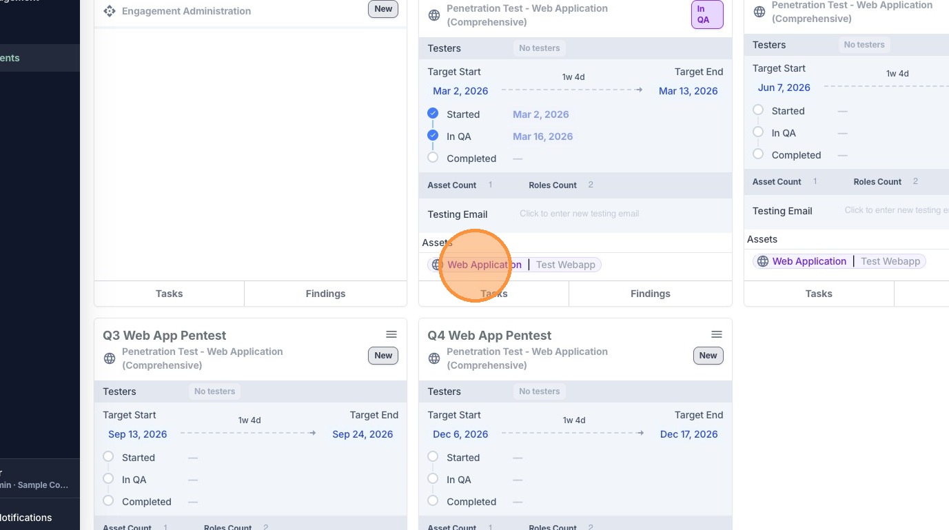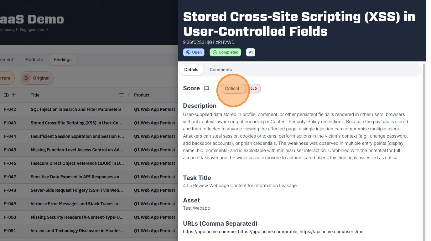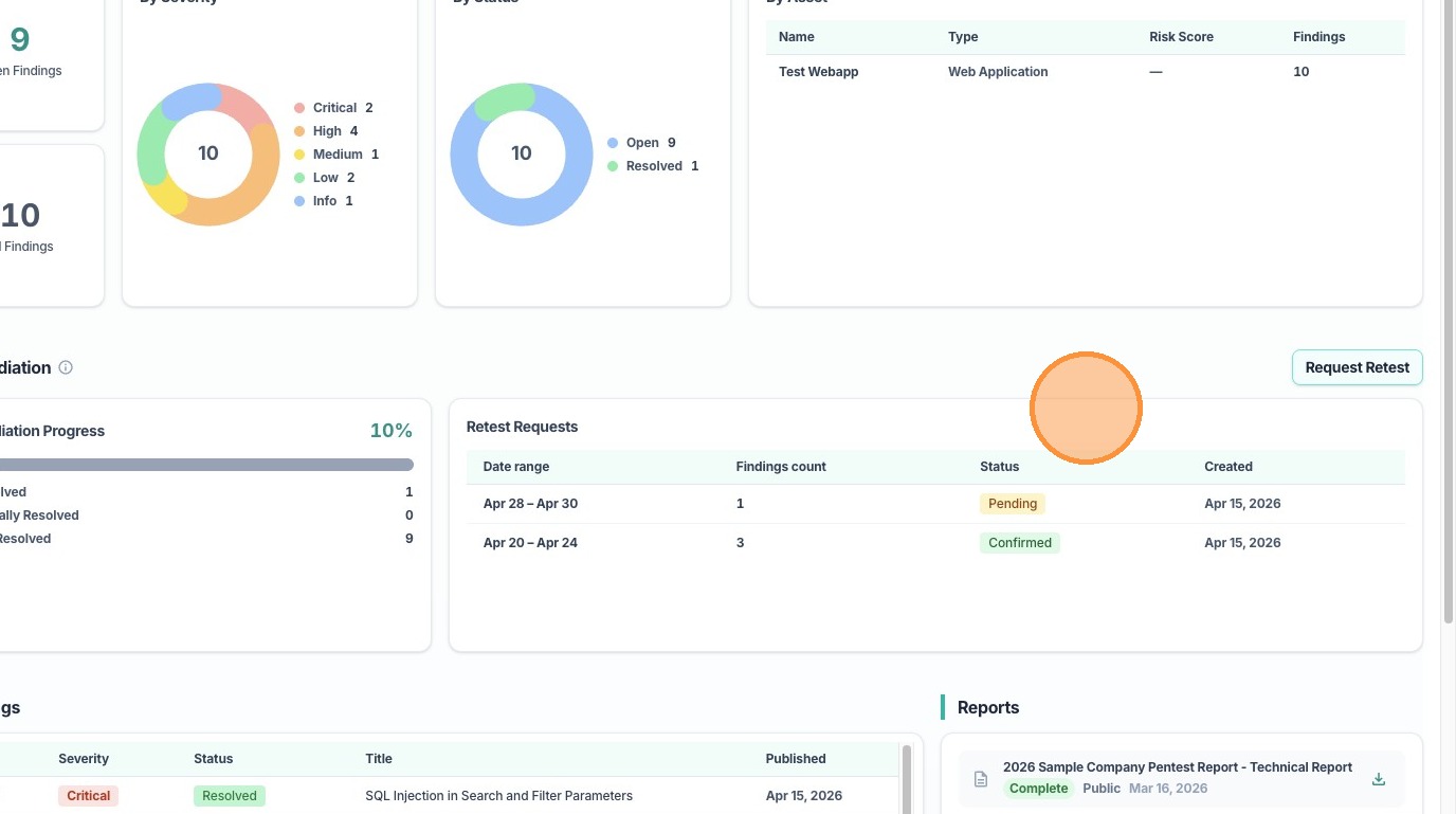 3. In the Dashboard, the first thing you will see is the engagement grades and progress. Original grade is calculated on all findings and Current grade is calculated on unresolved findings only.