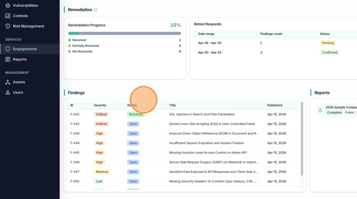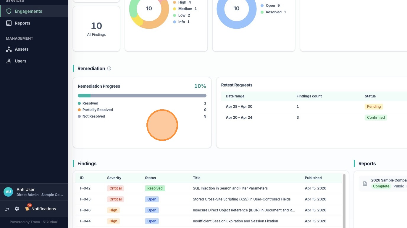 7. In the Remediation section, you will see your remediation progress on all findings in this engagement.