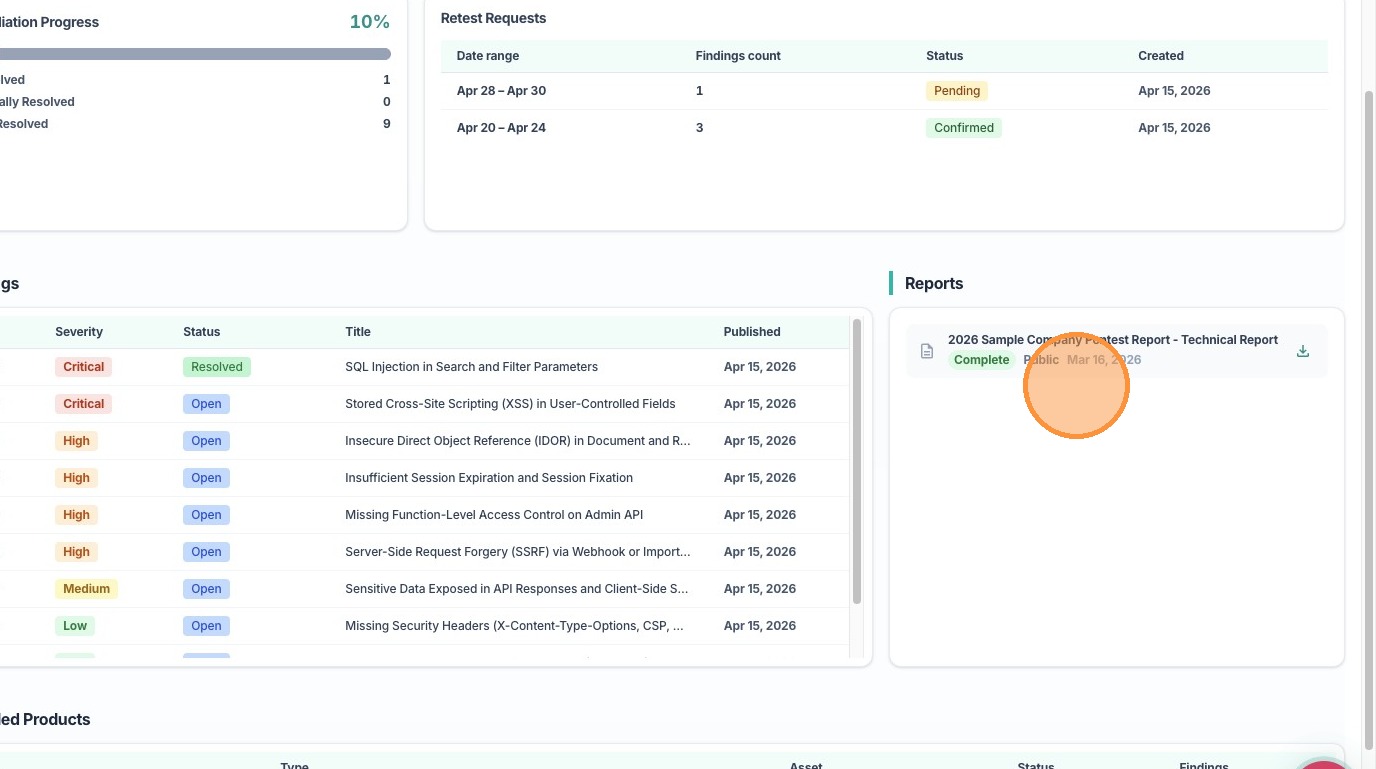 10. In the Reports section, you can see a list of all reports generated for this engagement and can choose to download any of them.
